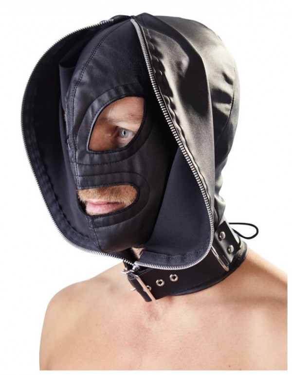 Внутренняя маска имеет разрезы на уровне глаз и рта. При этом, внешняя маска просто открывается и образует своеобразный воротник! Если же, Вам необходима полнейшая депривация закрываем молнию!